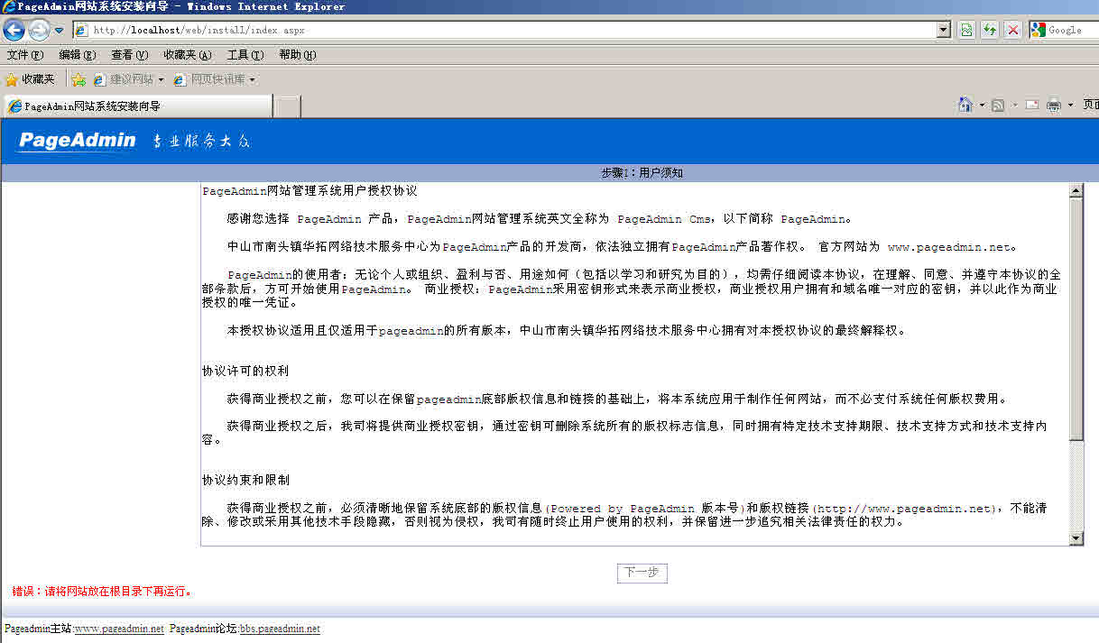 http://localhost/web/install/index.aspx出现初始化界面,,点击下一步后.......提示: 错误:请将网站放在根目录下再运行。