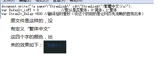 Ttos.js原代码:document.write("<a name=\"StranLink\" id=\"StranLink\">繁體中文</a>");