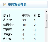 - <tr><td>部 门</td><td> 投稿数</td><td> 排 名</td></tr>