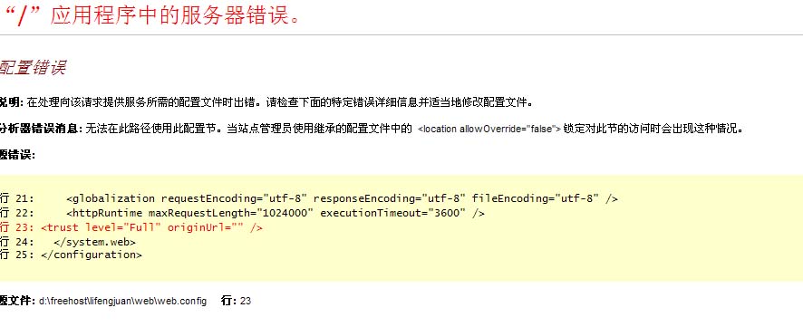 上传到空间后我浏览网页出现如图情况,我把web.config中的“<trust level="Full" originUrl="" />”,后台打不开了