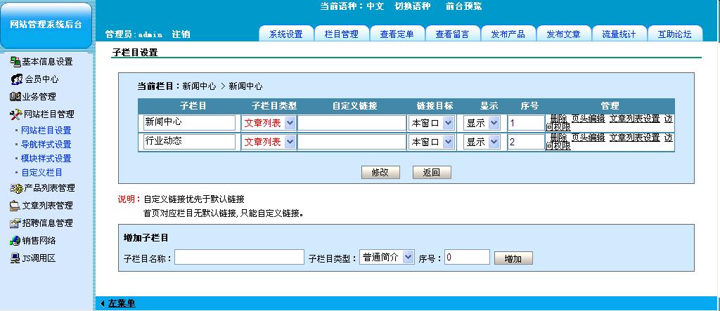 www.0898boyi.cn。是别人代做的。我看着排版太死板,就想改改版面。我想这样修改:把文章导航换成新闻中心,把行业动态放在修改后的新闻中心下面。把关于我们换成flash,把关于我们放在flash下面。有哪位高手能教我一下吗。我的QQ是515496161.期待给位高手的回复。我是按下面操作的栏目管理-----导航设置------子目录设置。请问可以把子栏目的内容移动到其他栏目的子目录下吗?如果能我该如何操作?还有我在插入flash怎么显示不了啊?请高手不吝赐教 附件是我的屏幕截图。我就想达到把文章导航换成新闻中心,把行业动态放在修改后的新闻中心下面。把关于我们换成flash,把关于我们放在flash下面这种效果。请各位高手给帮忙看下。不胜感激。有什么特别的指导可以加我QQ,或是给我发邮件。谢谢!