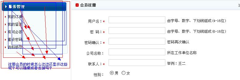 :( 会员注册的时候 总会发现左边那里出现 服务管理 那些东西 那些应该是 注册成功后登陆才可以看到的东西。 怎么没有注册就 出现在那里了 :( 可不可以隐藏 或者 去掉啊 在那个文件里面可以修改