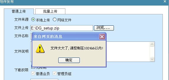 先检查“文章资讯”表单——“附件”字段里面的文件大小值有没限制为1024,如果改了还是不行的话再改iis上传限制。