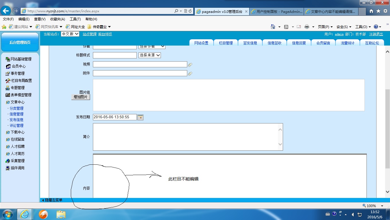 pageadmin后台管理登录后,对“文章中心”的一篇文章进行修改,但“内容”栏不能点击修改,请高手指教