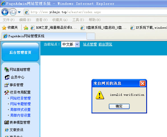 ]xiyou老师帮忙看看呀登录后台管理,无论点任意设置都弹出invalid verification!点确定即关闭页面,回到登录后台页面!怎么解决? 默认文档也对!dns也没有问题!网站是[url]www.yihujx.top[/url]在本地调试没有问题,上传到空间安装后就成这样了。我用的是直接从官网上下的模板(这是模板地址:[url]http://www.pageadmin.net/moban/company/389.html[/url]),版权了什么也没有改,也没有用SQL数据库。
