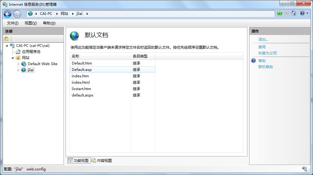 会不会是这个默认文档的问题,因为我点开其中没有index.aspx,然后我添加完了,它的条目类型是本地,怎么改成继承?