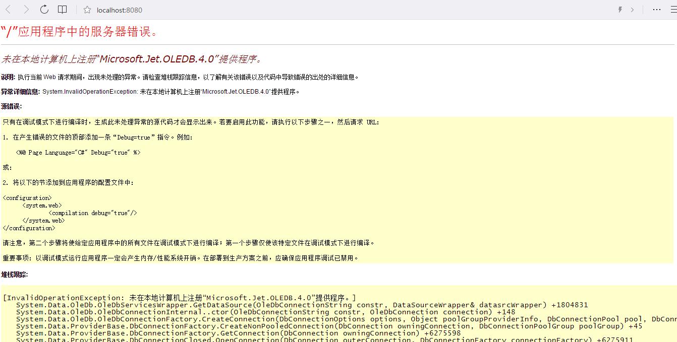 设置好了,现在跳出来这个错误 未在本地计算机上注册“Microsoft.Jet.OLEDB.4.0”提供程序。