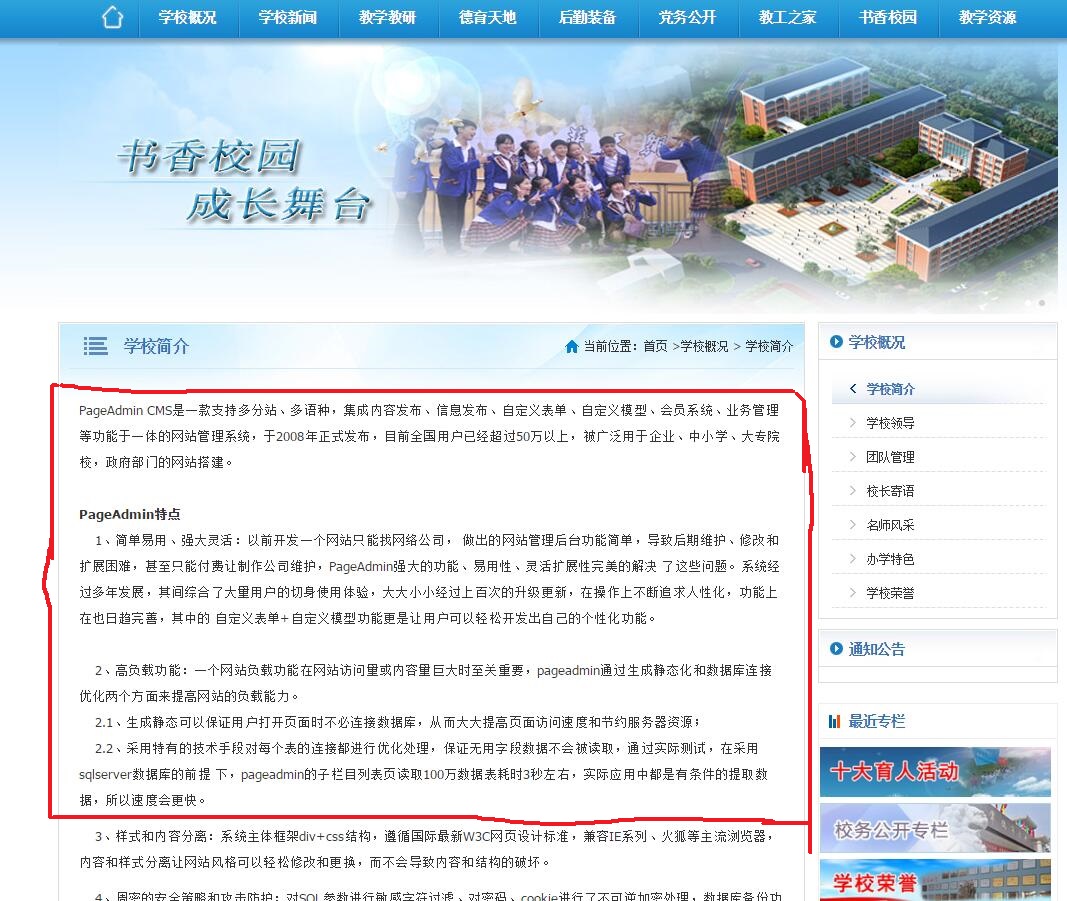如下图的学校简介的内容如何更换?