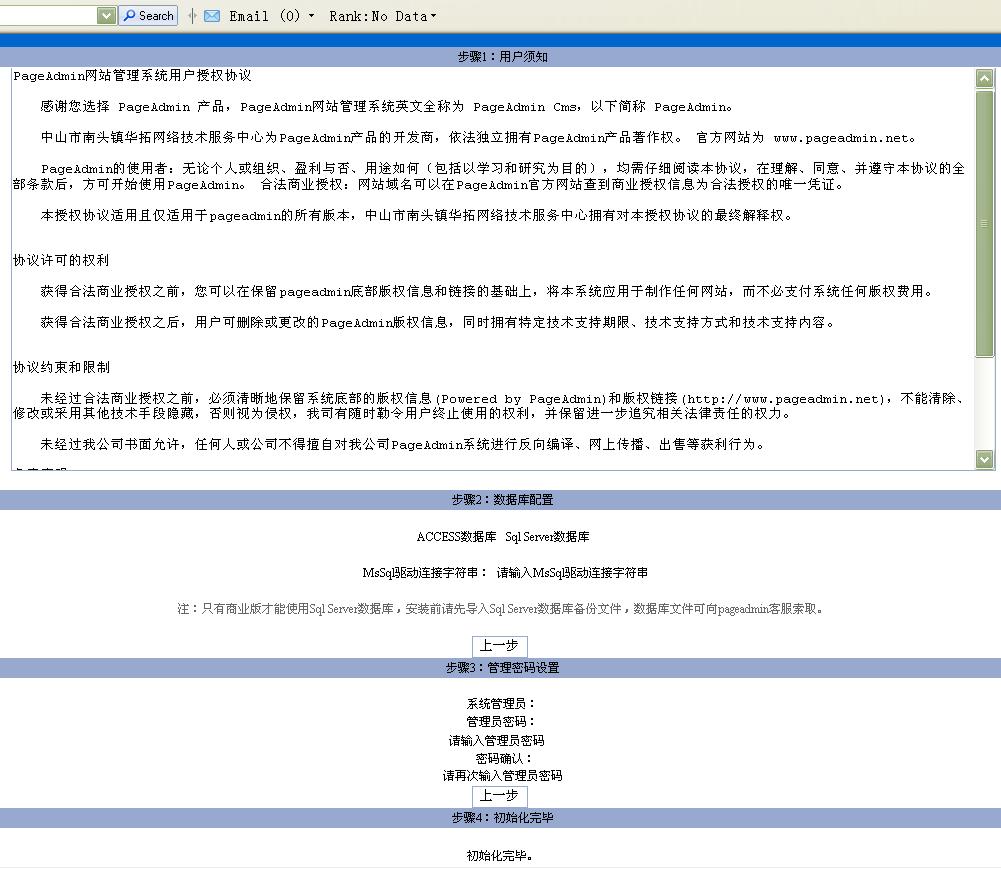终于上传到服务器成功,然后我点击http://我的域名/install/index.aspx 出现下面的情况。。。本来分几步走的怎么一下都显示出来了。。还没有"下一步",只有"上一步"。 跳过它我试着点http://我的域名/master/login.aspx也有显示不正常,看不到关键的验证码。哪位能指点指点,谢谢