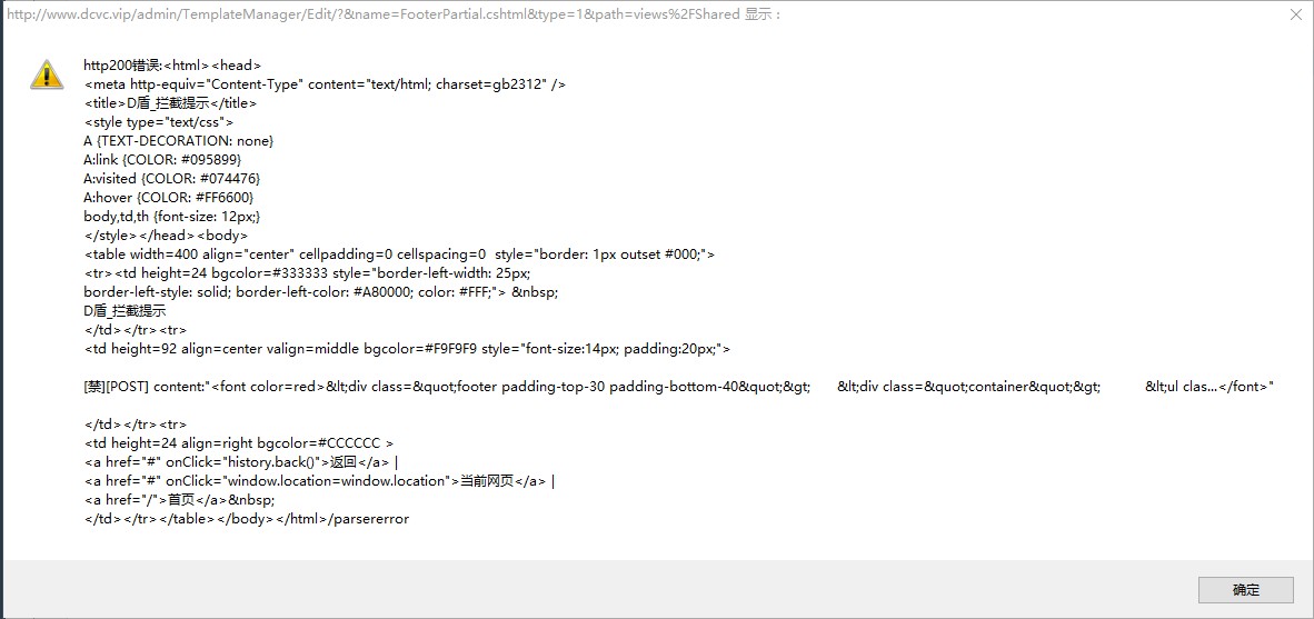 你服务器安装了D盾这个软件,拦截了客户端的html,设置一下软件放行网站