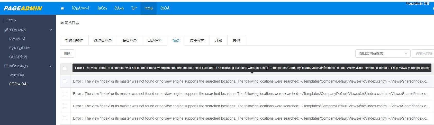 后台日志错误为:Error:The view 'index' or its master was not found or no view engine supports the searched locations. The following locations were searched: ~/Templates/CompanyDefault/Views/ê×ò³/index.cshtml ~/Views/Shared/index.cshtml