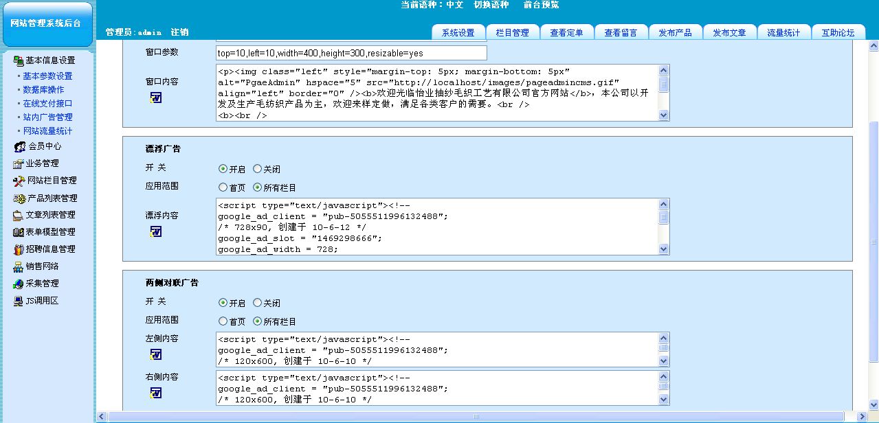 怡业抽纱毛织工艺有限公司。现在用的广告是我在发表文章时选择“源代码”然后加入的。在后台设置的全站广告,一个都没不能用。