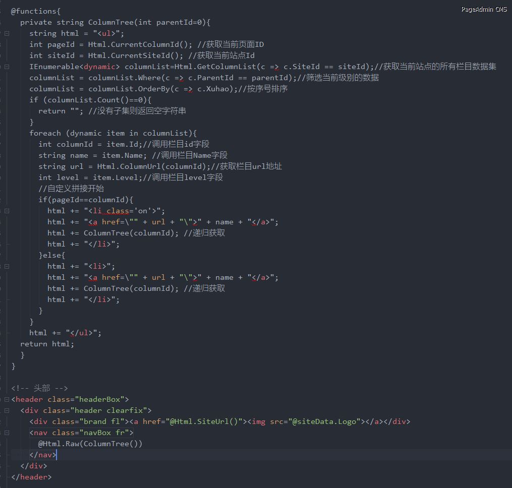 普通需求用默认的Html.SiteColumnsHtml()标签就可以了,不需要自己写栏目树结构
