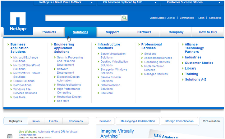 3. NETAPP 网站的下拉菜单和特效?以及顶部的蓝色背景!这种下拉菜单真的太牛了!大家以为呢?