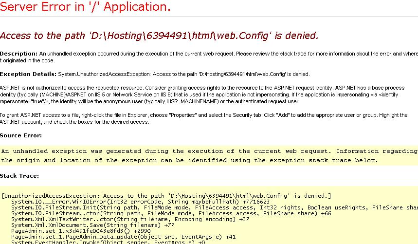 Exception Details: System.UnauthorizedAccessException: Access to the path 'D:\Hosting\6394491\html\web.Config' is denied.