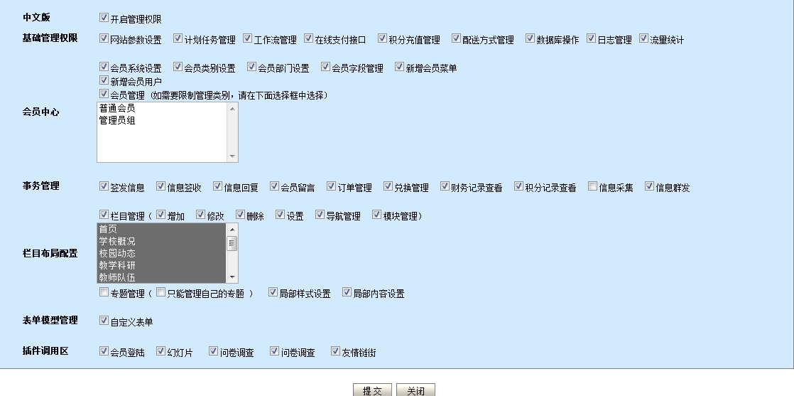 问题二:管理员进后台,左侧没有了文章中心等菜单,只有图(二)的几个项目。进admin账号进去设置文章中心,(图三)发现也没有此项的设置。