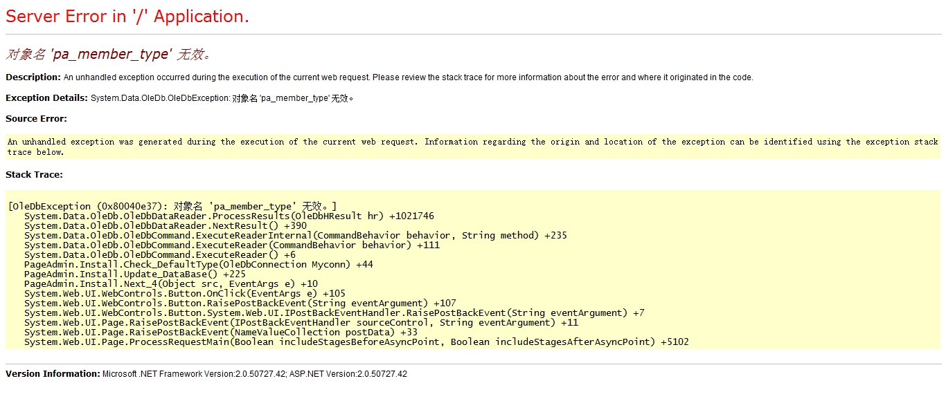 安装到第四步出错:对象名 'pa_member_type' 无效。