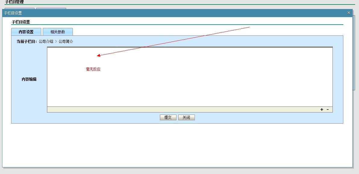 进到子栏目设置里的内容设置,内容框没有反应,无法输入内容,求高手解救,在线等。