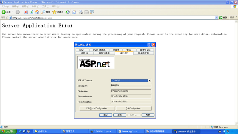 XP系统,本地电脑。安装iss5.1和framework 2.0后打开localhost显示错误,iis默认网站的属性中也点击了asp.net2.0,还是无法打开localhost。如图所示,有没有遇见相同情况的同胞,求教各位大侠帮助。