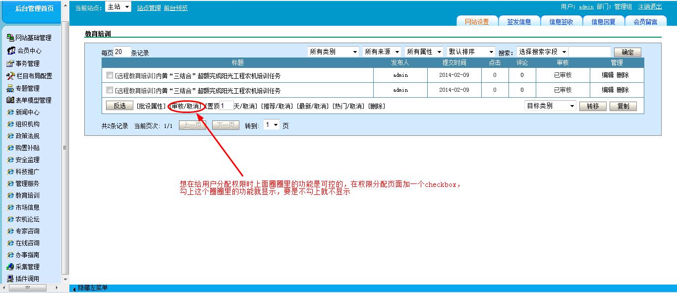 xiyou 假如我现在给用户A分配后台权限,怎么在后台的用户权限分配页面(admin_permissions.aspx)来实现控制这个用户A登录进后台后是否能看到下图的“审核/取消”这个功能按钮呢