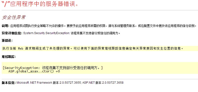 空间商的答复是:由于安全问题,我们这边限制了.NET程序的4个危险操作: A.调用非托管代码,如调用任何exe,或COM组件 B.调用服务组件。 C.写入事件日志。 D.访问 Microsoft“消息队列”队列。