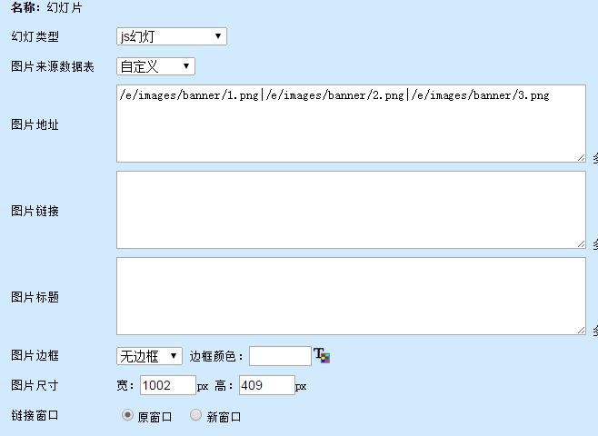 一:我把自己的幻灯片用ftp上传到原先存放幻灯片的路径/e/images/banner, 在后台(插件调用-幻灯片-参数设置)改成我的文件名,第一次只上传了一张,提交成功后,开始没改变,好像多刷新了两次就显示了。但是,等我再以同样方式操作第二三张图片时,始终无法成功了,前台模板自带的幻灯片始终没有改变。之后又尝试了多次,始终无效。