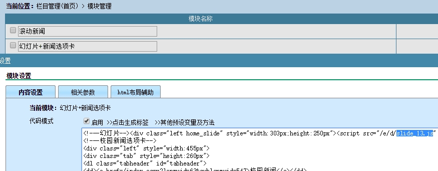打开“栏目管理”—“首页”—“模块管理”—“幻灯片+新闻选项卡”—“内容设置”,点开后如下图: