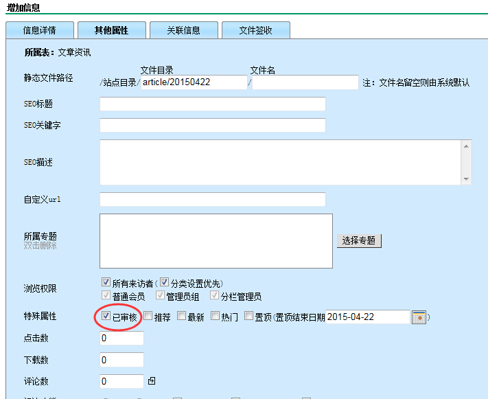 我就是想把发布信息中的默认属性 “已审核” 默认勾选去掉,就这么简单,设置了好多地方都没有,请大神指点!