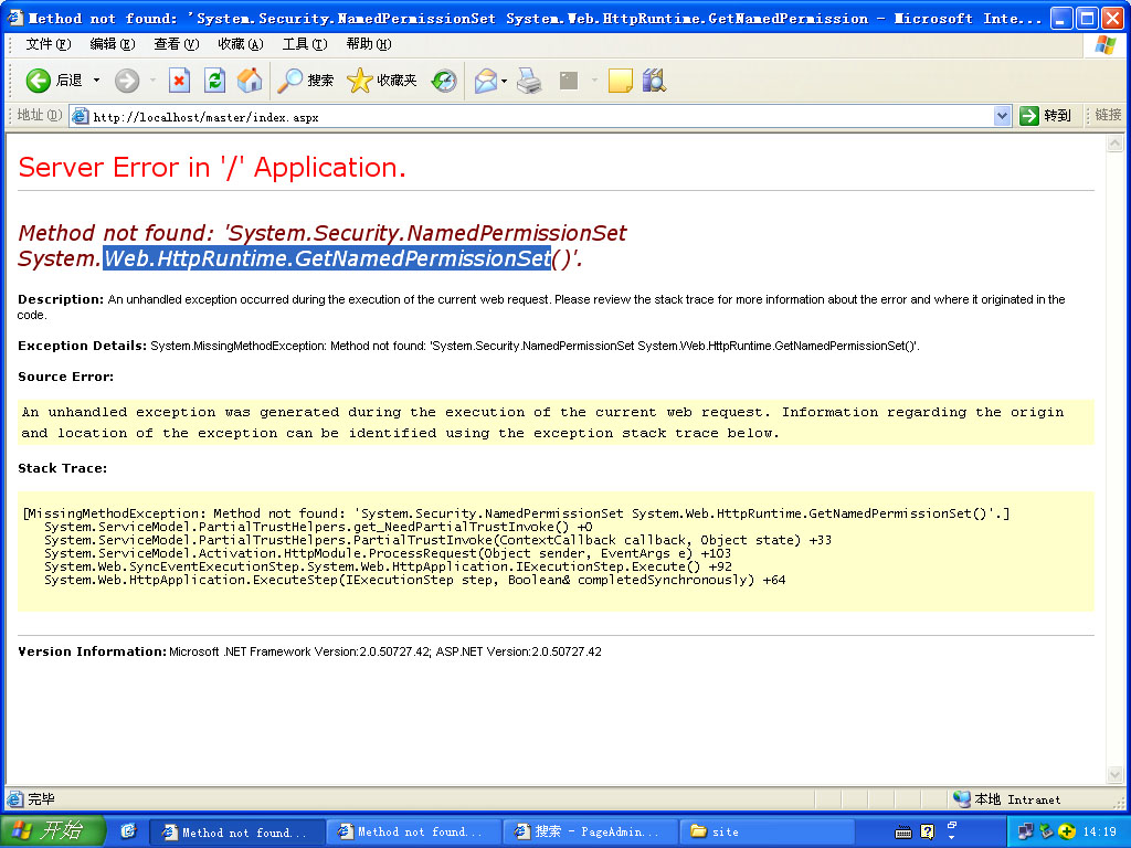 Method not found: 'System.Security.NamedPermissionSet System.Web.HttpRuntime.GetNamedPermissionSet()'.
