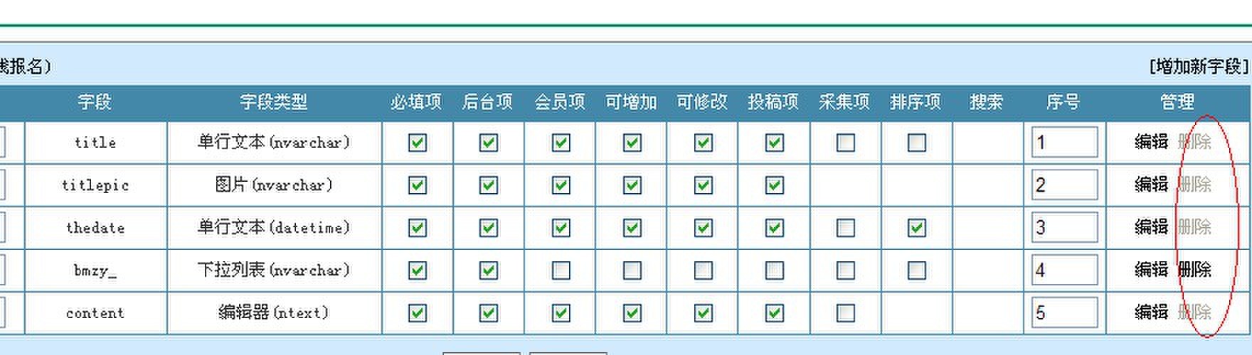 默认字段为什么要删除??你不要可以不用就行了,比如什么后台项,会员项这些不要选择就行,title字段最好利用起来,你可以改为其他名字