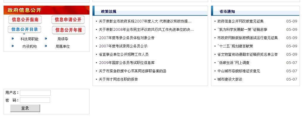 你的模块的顺序不对,要把登录界面那个模块顺序设置为第二,然后把政策法规栏设置为换行显示(如果设置后没换行显示就增大一点此模块宽度)