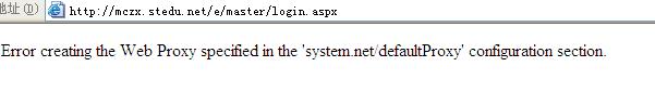 http://mczx.stedu.net/e/master/login.aspx,输入后台管理目录,可以看到登陆界面,输入用户名密码后出现一句提示“Error creating the Web Proxy specified in the 'system.net/defaultProxy' configuration section.”