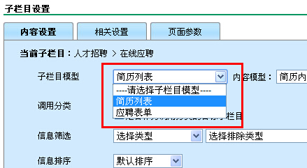 首页调用人才简历/人才招聘时这个模块模型怎么设置啊?