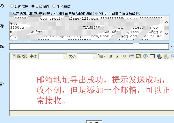 邮箱配置正确,测试成功。信息群发,指定发件人导入第一页正常,第二页出错。群发邮件提示成功,但是没有成功发送,填入一个邮件地址,正常接收,求大神解决。