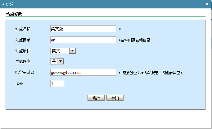 "绑定子域名:不开启子域名请不要填写,如果你需要用en.yourdomain.cn类似子域名,那么你在iis中必须新建一个站点,这个站点需绑定域名en.yourdomain.cn,并且把pageadmin文件复制一份到对应站点目录下。 "