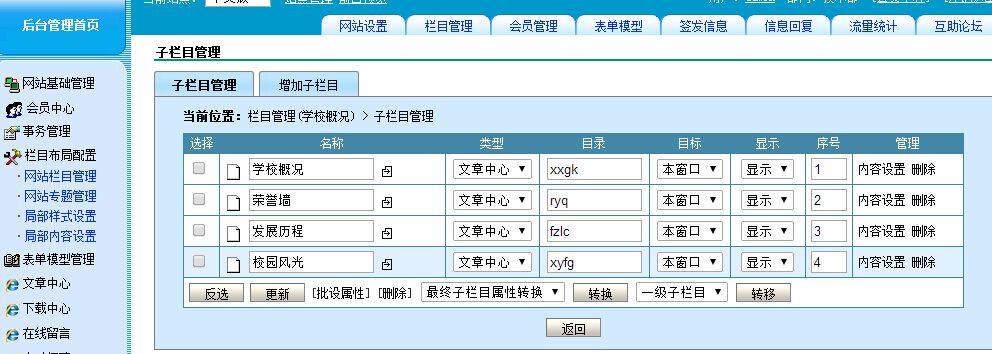 我在首页前台能看到这两个子栏目 在后台子栏目管理的时候也出现,但是我要去修改内容或者去在这两个子栏目发布信息就不行,找了很久 不知道是什么原因 求助各位大侠!