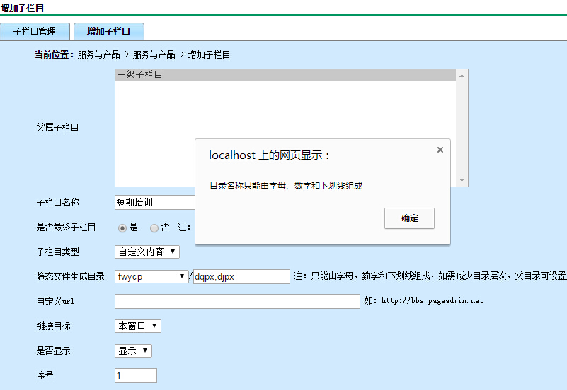 在 增加子栏目中 修改子栏目名称时 提示 目录名称只能由字母、数...