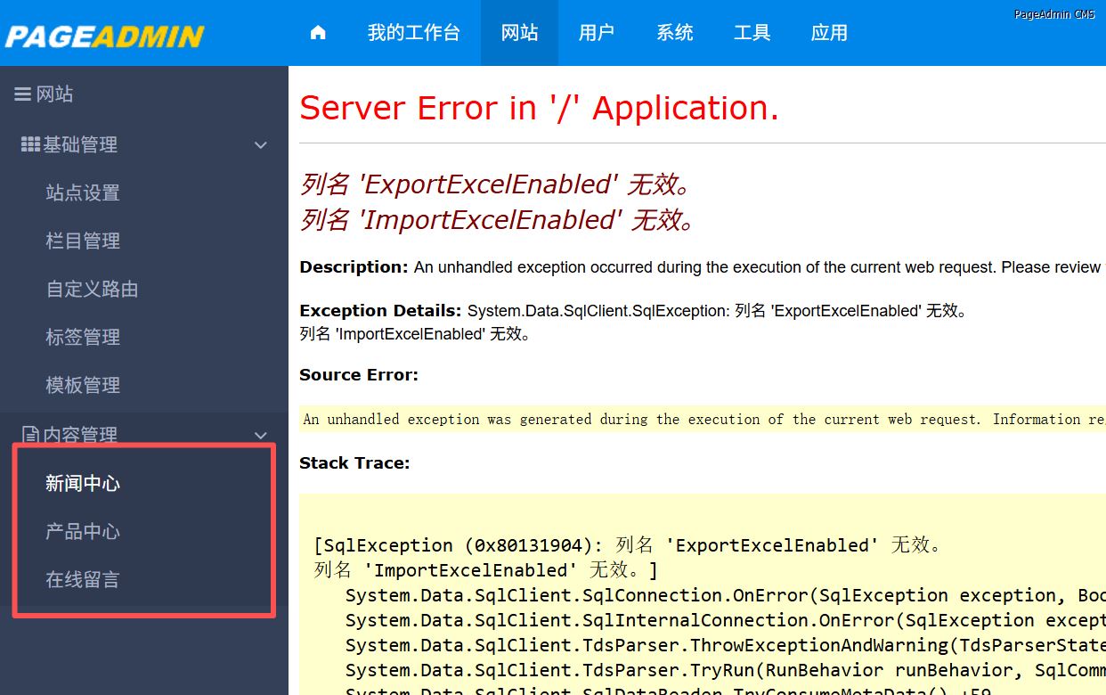 我安装好点击后台管理里的内容管理提示列名 'ExportExcelEnabled...