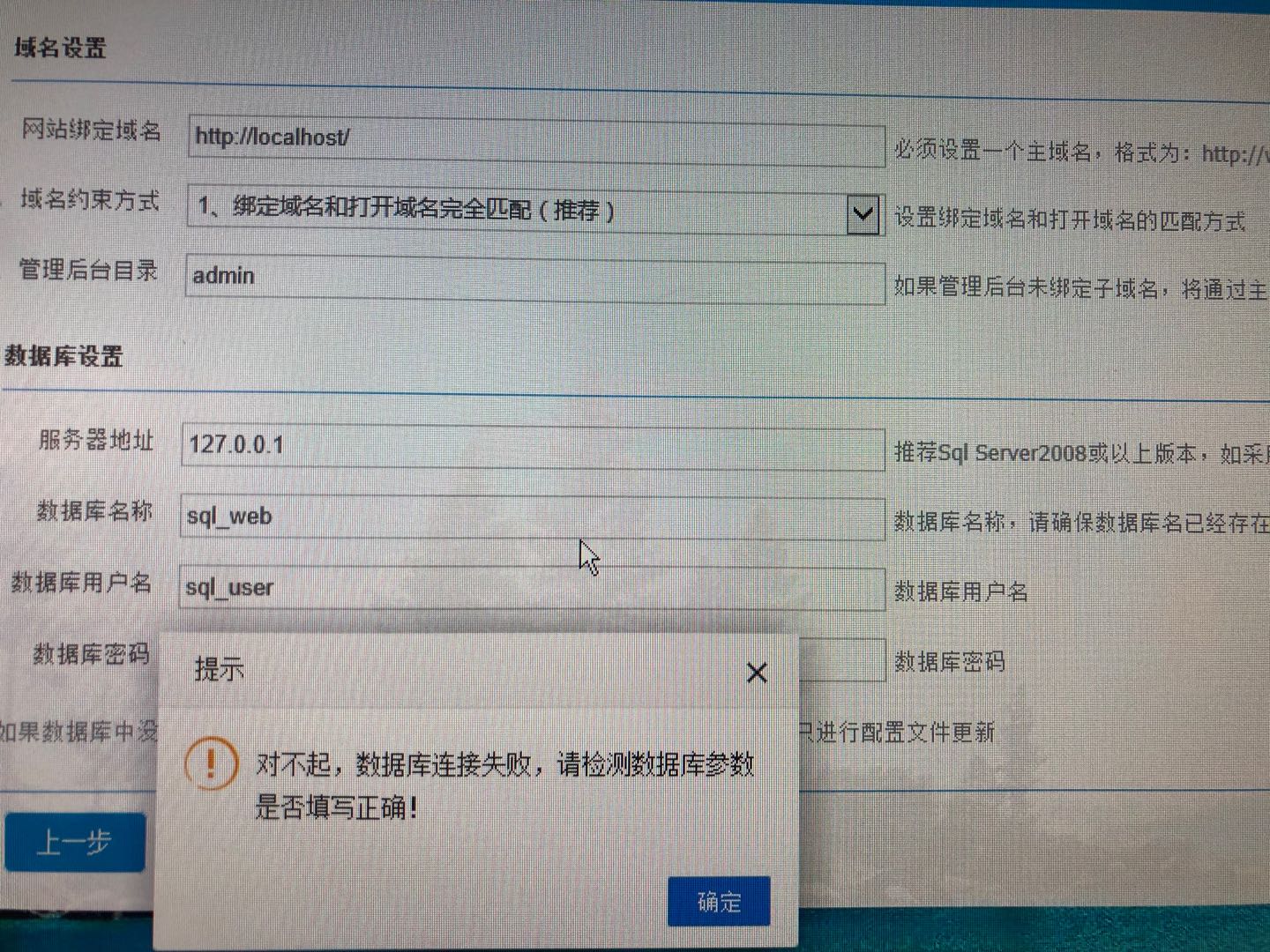 安装初始化到“网站配置”步骤出错,数据库连接失败